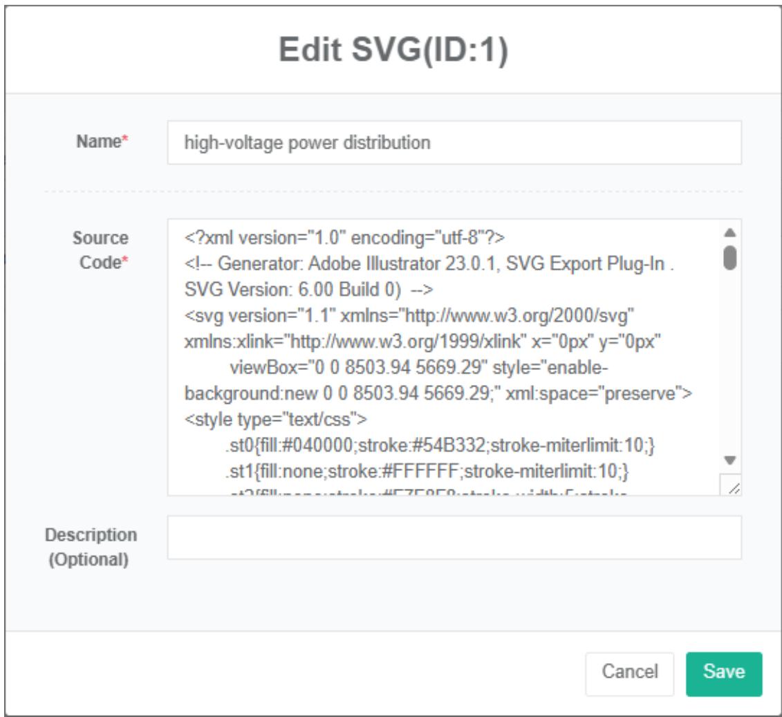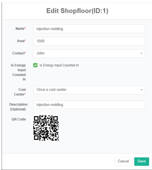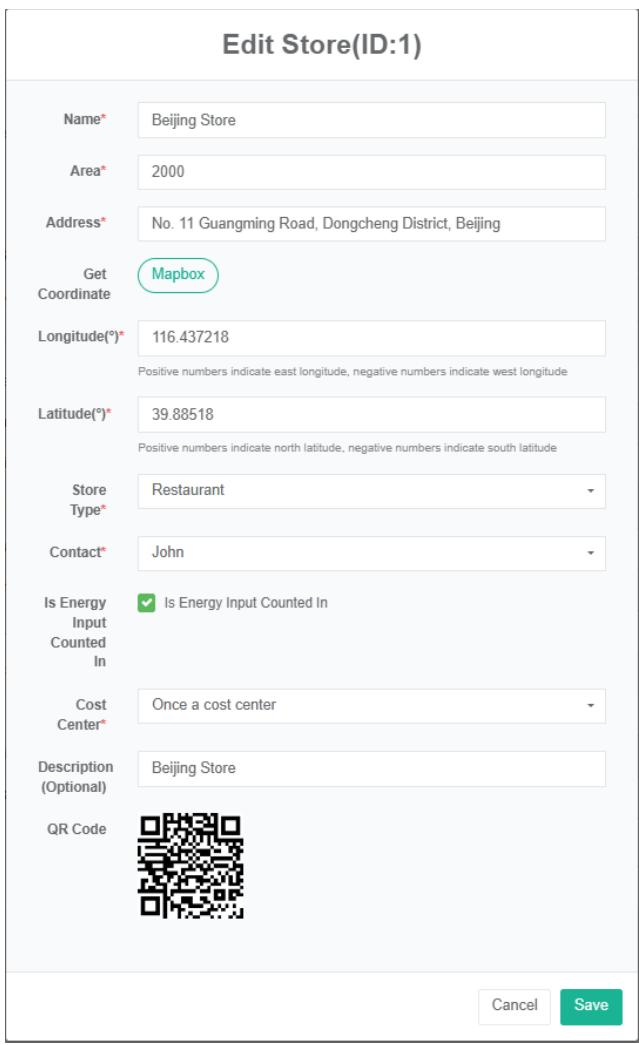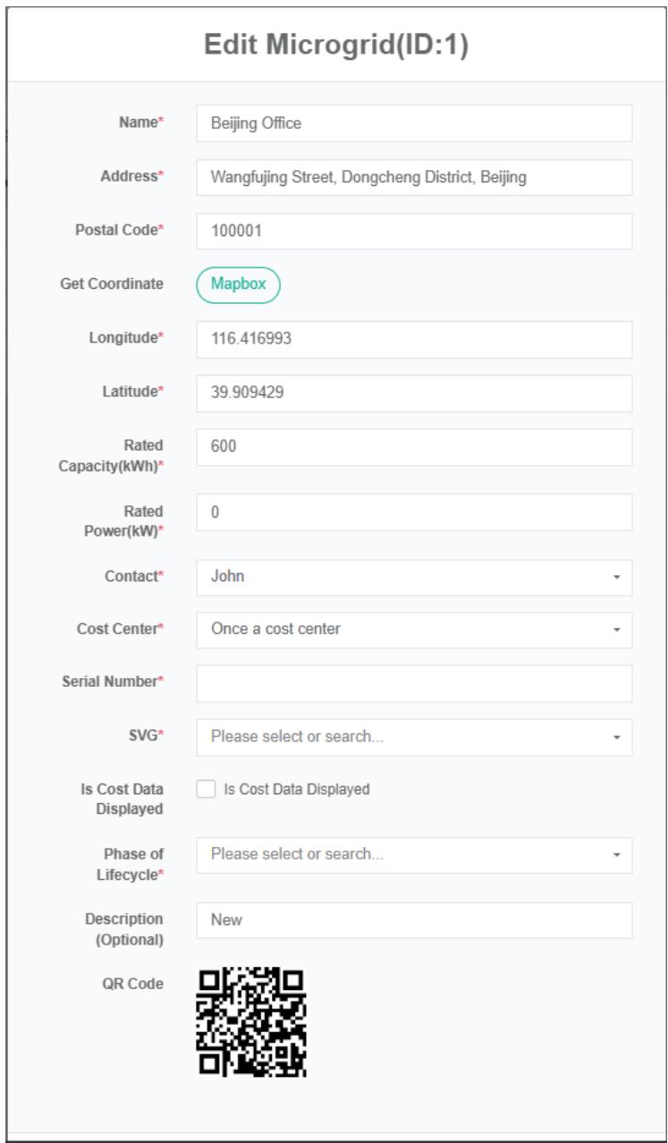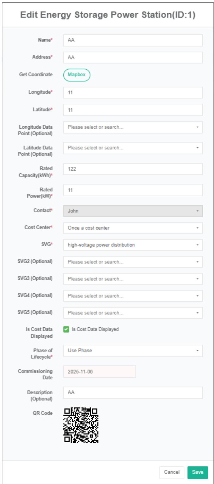 - Di kotak dialog 'edit ladang angin', masukkan 'nama', 'alamat', lintang, bujur, daya terukur, 'Kontak', 'Pusat biaya', 'SVG', dan 'deskripsi'.