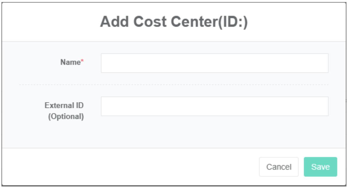- Masukkan 'nama' dan 'ID eksternal' di kotak dialog 'tambah pusat biaya'.