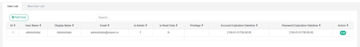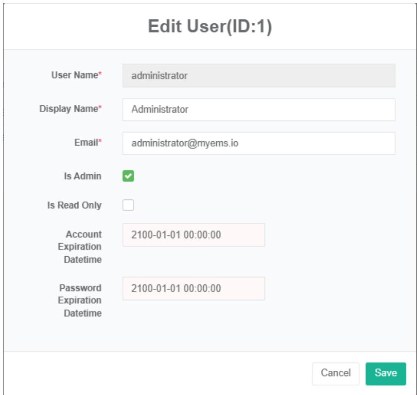 - Masukkan 'nama pengguna', 'kata sandi', 'nama tampilan', 'email', 'administrator', dan 'hak akses' di kotak dialog edit pengguna.