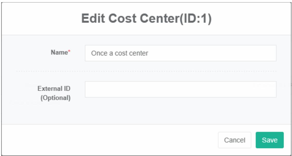 - Ketik 'nama' dan 'ID eksternal' di kotak dialog edit pusat biaya.