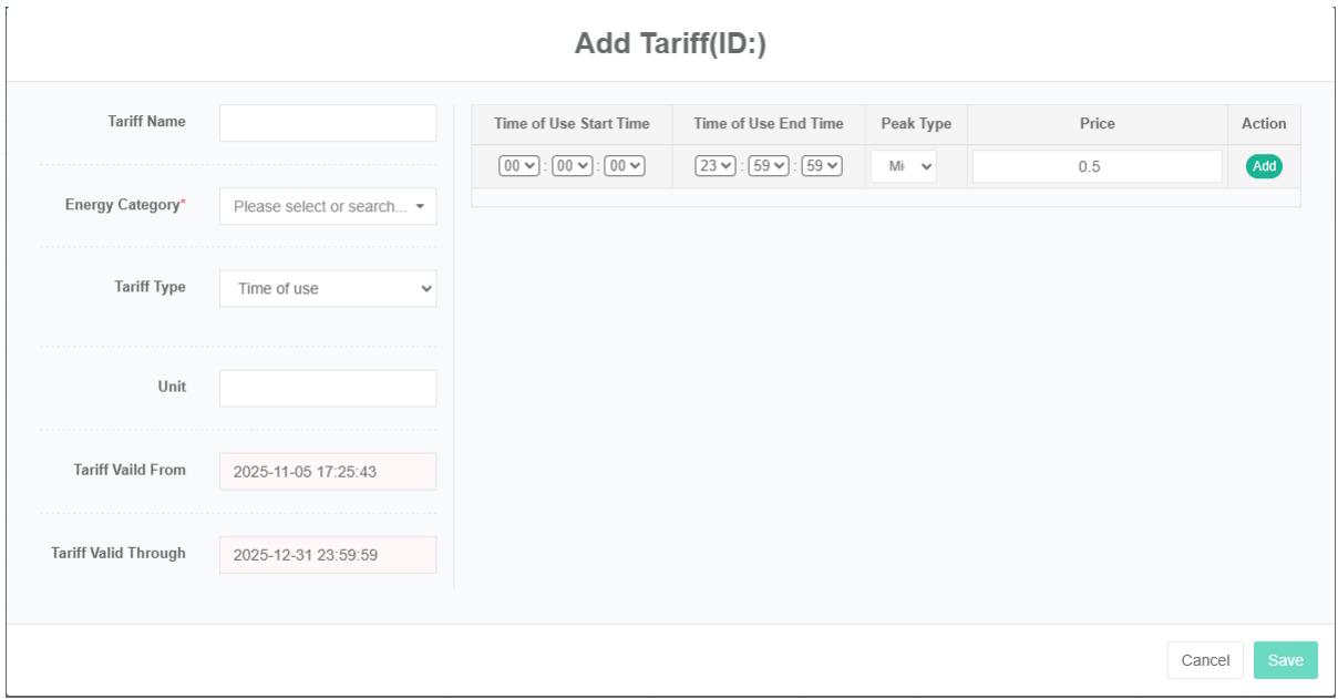 - Pada kotak dialog 'tambah tarif', masukkan "Nama", "Kategori energi", dan "Jenis tarif", "unit", "tanggal mulai tarif", dan "masa berlaku tarif berakhir".