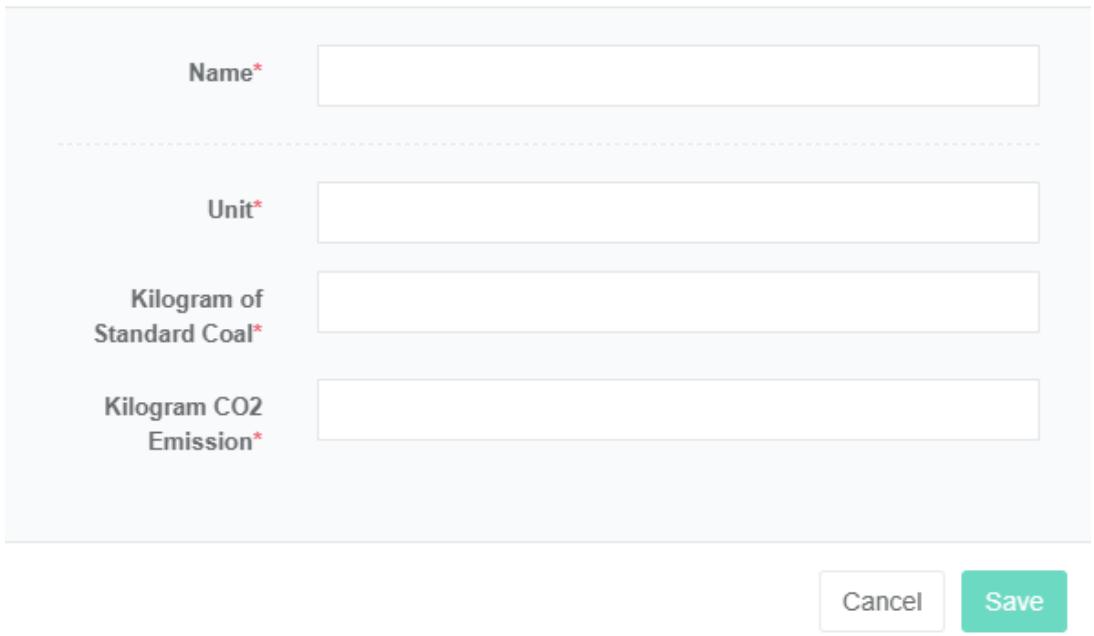 - Pada kotak dialog 'tambah kategori energi', masukkan "Nama", "Satuan", "Kg batubara standar" dan "kilogram emisi karbon dioksida".